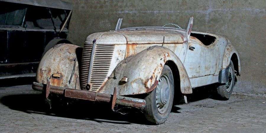 Sortie en 1938, l’Amilcar B38 dite “Compound” qui veut dire en français “composé” est une voiture révolutionnaire à l’époque grâce à son châssis moulé en alpax, alliage léger à base d’aluminium. Repris par Hotchkiss, la marque Amilcar bénéficie d’un nouveau bureau de style dont provient Clément Vinciguerra, le styliste à qui nous devons cet élégant roadster. Egalement disponible en coach et coach découvrable, c’est bien le roadster qui reste à ce jour le plus difficile à trouver. Il n’en resterait que 70 exemplaires recensés. La B38 Compound Roadster est animée par un petit 4 cylindre de 1185 cm3 développant 33 chevaux. Les 4 roues sont indépendantes et la boîte 4 vitesses est synchronisée sur les 3ème et 4ème rapports. L’exemplaire que nous présentons n’est pas complet et constitue un projet de restauration. La caisse est dans un état globalement correct mais les planchers devront être refaits. Les banquettes sont absentes mais de nombreux accessoires sont livrés avec la voiture. Côté mécanique, le bloc moteur est présent mais nécessitera une remise en état à l’image de l’ensemble.