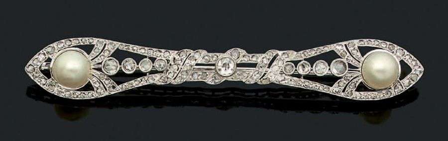 Perles fines, diamants taille ancienne et taille rose, or gris 18K (750), platine (950).