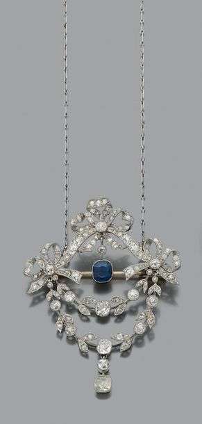 Saphir, diamants taille ancienne, taille rose, platine (850) et or 18K (750).