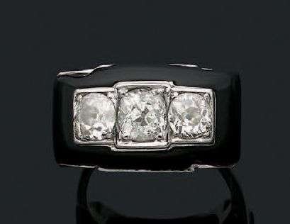 Diamants taille ancienne, onyx, platine (950) et or 18K (750). Travail français.