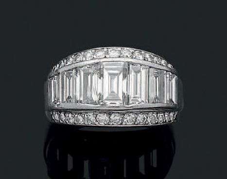 Diamants de taille émeraude, baguettes et brillants, platine (850).