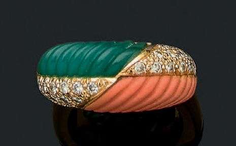 BAGUE Chrysoprase et corail gravés, diamants, or jaune 18K (750).