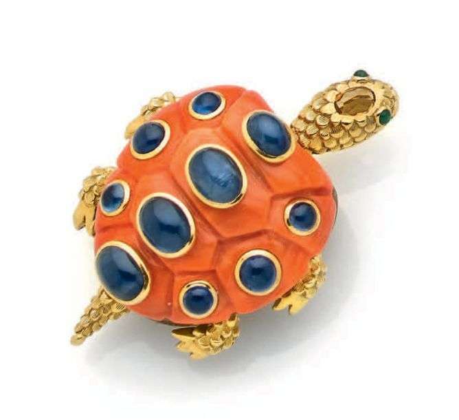 Corail, cabochons de saphirs, émeraudes, citrine et bois, or jaune 18K (750). Signé.
