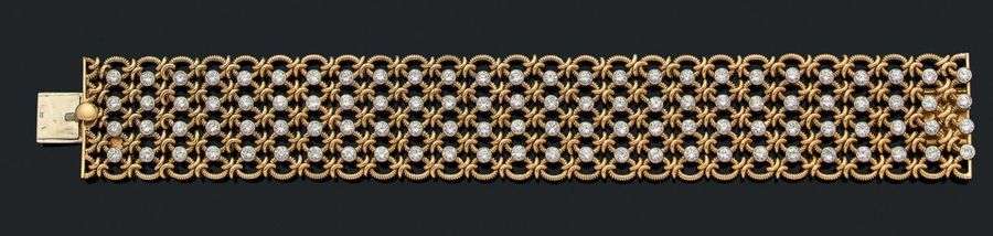 Bracelet «résille». Diamants, or 18K (750) et platine (850). Signé. Vers 1960. Écrin. L.: 17.5 cm env. - Pb.: 67.3 gr