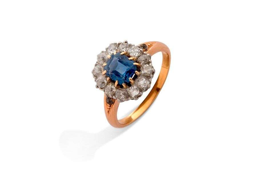 Saphir dans un entourage de diamants, or rose 18K (750), platine (850).