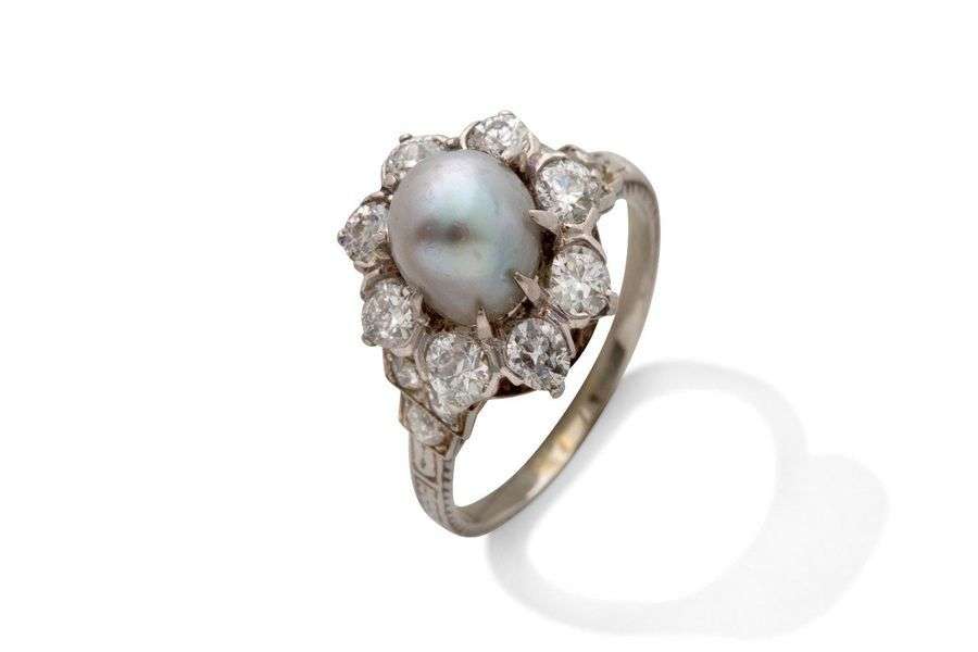 Perle fine grise, diamants de taille ancienne, platine (850) et or gris 18K (750).