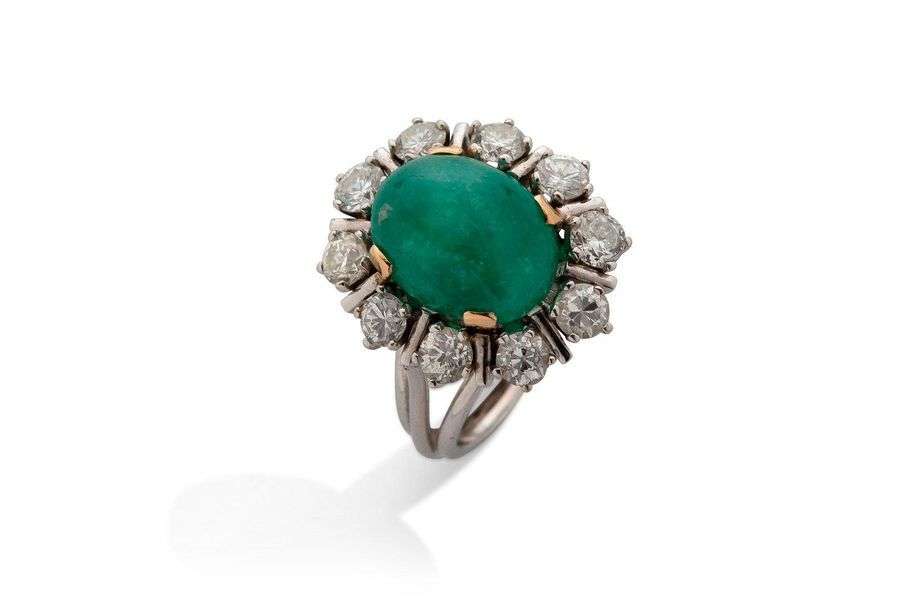 Cabochons d'Èmeraude dans un entourage de diamants de taille ancienne, or 18K (750).