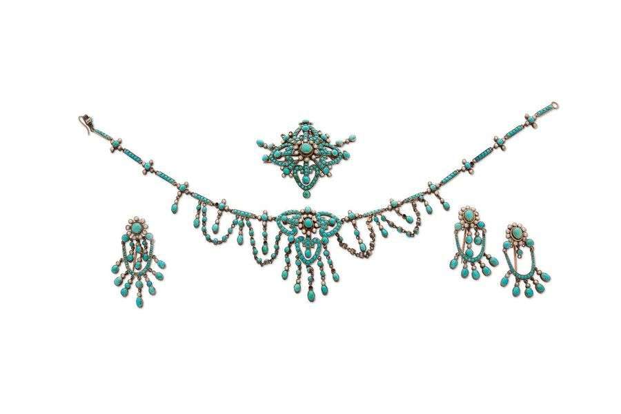 parure composÈe d'un collier et de 4 broches, turquoises, perles, argent (<800). Manques, en l'Ètat.