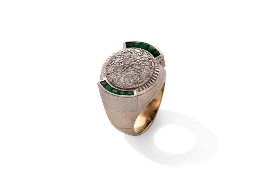 pavage de diamants ÈpaulÈ de deux lignes d'Èmeraudes calibrÈs.