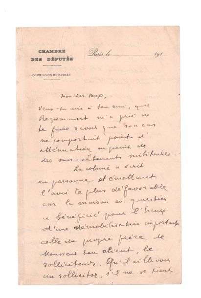 Paris, circa 1917. 2 pages in-8 sur papier à entête de la Chambre des Députés.