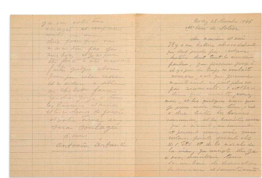 Lettre autographe signée adressée à René de SOLIER Rodez, 28 novembre 1945. 4 pages in-4 au crayon sur papier d'écolier (pliures horizontales et verticales).