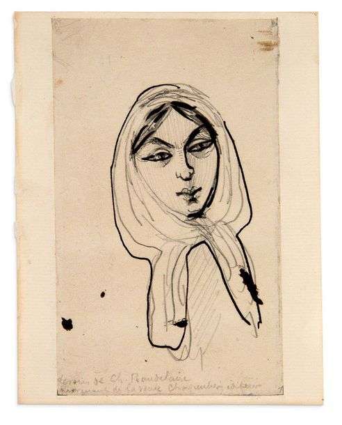 Précieux portrait de sa maîtresse «maudite». Un des quatre dessins que Baudelaire a laissé de Jeanne Duval, dont aucun n'est légendé du nom de celle-ci, exécutés à plusieurs moments de sa vie : «La seule femme que j'aie aimée» (lettre à Narcisse Ancelle, 30 juin 1845). Jeanne Duval occupe une place centrale dans la vie et l'oeuvre de Baudelaire. Il la rencontre au printemps 1842, et vécut par intermittences avec elle pendant près de vingt ans une passion tempétueuse qui évolua en amour charitable quand la belle, vieillie et s'éloignant de lui, fut devenue une «épave».
