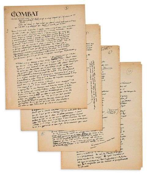 L'Homme révolté, fragment de manuscrit autographe [1950], 11 feuillets in-4 sur papier à entête de la revue Combat, numérotés de 2 à 12.