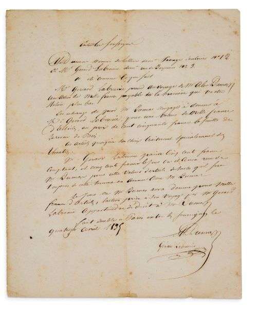 Contrat manuscrit entre Alexandre Dumas et Gérard de Nerval. Le texte du contrat est de la main de Dumas, avec sa signature, et est aussi signé «Gérard Labrunie» de la main de Nerval.