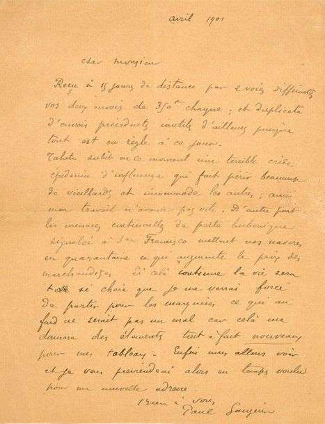 Lettre autographe signée adressée vraisemblablement à Ambroise Vollard dans laquelle il évoque son départ pour les Marquises. «Tahiti subit en ce moment une terrible crise épidémie d'influenza qui fait périr beaucoup de vieillards et incommode les autres : aussi mon travail n'avance pas vite. D'autre part les menaces continuelles de peste bubonique signalée à San Francisco mettent nos navires en quarantaine ce qui augmente le prix des marchandises. Si cela continue la vie sera si chère que je me verrai forcé de partir pour les marquises ce qui au fond ne serait pas un mal car cela me donnera des éléments tout à fait nouveaux pour mes tableaux».