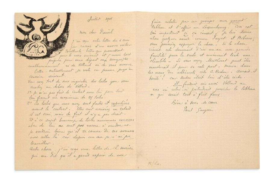 Lettre autographe signée adressée à Daniel de Monfreid [Tahiti], juillet 1901. 2 pages grand in-8 à l'encre sur papier quadrillé portant un BOIS gravé de Paul Gauguin.