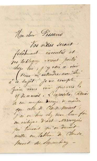 Lettre autographe signée adressée à Camille PISSARRO S.l.n.d. [1882]. 2 pages ¼ in-12 à l'encre sur un double feuillet de vélin ivoire (pliures). «Mon cher Pissarro, Vos ordres seront fidèlement exécutés et vos tableaux seront portés chez lui| j'y vais ce soir (pour m'entendre avec lui à ce sujet. Je ne compte guère vous voir que vers le 21 de ce mois. L'exposition Renoir a un peu moins de monde que celle de Claude Monet| j'ai vu hier chez mon beau frère un critique d'art norvégien qui trouvait qu'on devrait mettre un tableau de Claude Monet au Luxembourg- Je vous envoie une petite chose de Théodore de Banville est ce du mouvement dont on parle ou d'un homme en particulier ? Monsieur Arosa a été enterré jeudi j'ai reçu une lettre de faire part pour vous confiée à mes soins (on ne savait pas votre adresse). Je ne vous l'envoie pas, c'est inutile mais je vous préviens pour que vous envoyiez votre carte, comme moi du reste qui n'y suis pas allé. Vous avez eu une série de beau temps. J'espère que vous avez pu travailler tout à votre aise. Et votre diner s'est il bien passé vous ne m'en parlez pas. Le syndicat s'est il formé avec les inamovibles et a-t-on décrété la mort des jaunes Quid ? [...]».