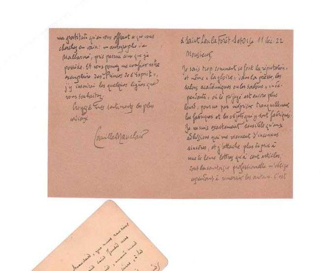 L'on joint une lettre de l'écrivain Camille MAUCLAIR à qui le billet de Mallarmé est adressé et qui l'offre au destinataire de sa lettre (4 pages in-12, enveloppe conservée).