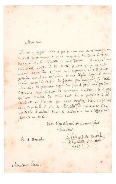 Lettre autographe signée de Gérard de Nerval à Auguste Cavé, alors directeur de la section des Beaux-Arts au ministère de l'Intérieur.