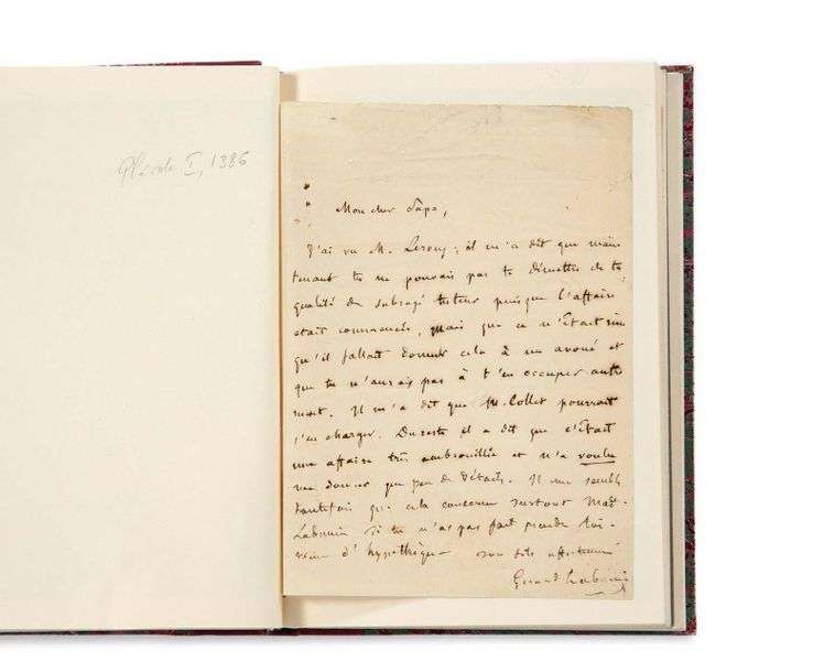 - Lettre autographe signée à son père, à propos d'une a.aire dont lui a fait part le notaire Alphonse Leroux, dans laquelle le père de Nerval est subrogé tuteur. S.l.n.d. [Paris, 1841 ?], 1 p. sur 1 f. in-12.