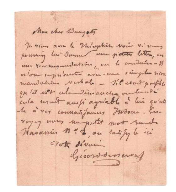 Texte concernant Théophile Gautier, que Nerval connaissait depuis 1826 où il était son condisciple au Lycée Charlemagne. «Je viens avec Théophile voir si vous pourriez lui donner une petite lettre, ou une recommandation, ou le conduire. Il n'ose se présenter avec une simple recommandation verbale. S'il était possible qu'il vit cela dimanche ou lundi cela serait aussi agréable à lui qu'utile à vos connaissances [...]».