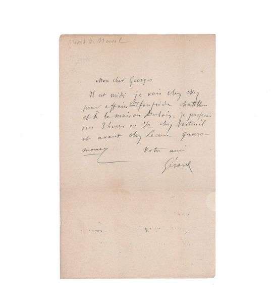 Rare billet autographe de Nerval à son ami, Georges Bell, homme de lettres, de son vrai nom Joachim Hournau, dans lequel il lui précise ce qu'il fera dès midi.
