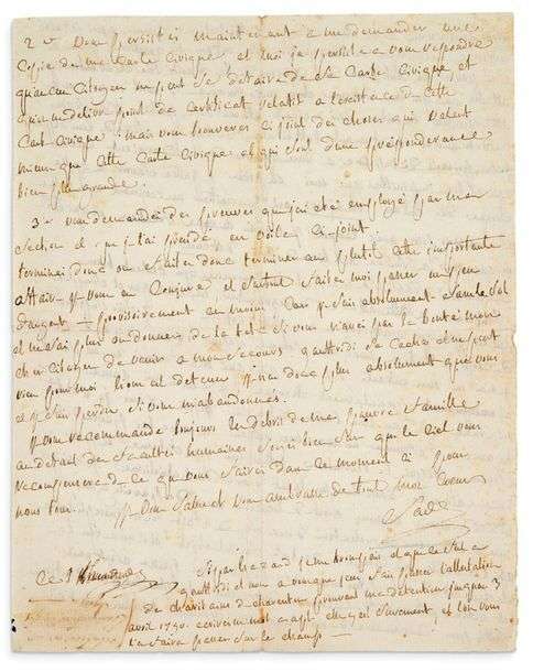Lettre véhémente écrite depuis l'hospice de Charenton, où Sade se défend de l'injuste accusation d'être responsable de l'émigration de ses enfants au moment de la Révolution, «un échafaudage de calomnies». «[...] Le certificat des citoyens de la Charité de Charenton qui atteste que j'ai été détenu chez eux jusqu'au 3 avril 1790| et à cette époque les enfants dont il s'agit étaient déjà partis [...] Je suis séparé de corps et de bien avec ma femme depuis 18 ans, il y en a 22 que je n'ai vu mes enfants, il y a en a 22 que ma femme en est seule et spécialement chargée, je ne les ai moi, jamais ni vus ni connus que dans leur tendre enfance. Depuis 18 ans je n'habite ni avec ma femme ni avec mes enfans ni avec les parens de ma femme| depuis la révolution, jettés moi par sistème et par reconnaissance dans le plus haut degré du patriotisme. Je n'ai pu ni n'ai du avoir aucune sorte de liaison avec de pareils gens, que diable me cherche-t-on donc sur ce fait. Il est inexplicable que l'on veuille me composer des torts sur cet objet, et il n'y a que la méchanceté ou la plus mauvaise volonté qui puisse soutenir cet échafaudage de calomnies contre moi, la plus légère atention suffit pour convaincre de mon innocence même le plus entêté [...]. GAUFFRIDI [son avocat] se cache et ne peut rien pour moi, LIONS est détenu je n'ai donc plus absolument que vous et je suis perdu si vous m'abandonnés. Je vous recommande toujours les débris de ma pauvre famille, à défaut des facultés humaines soyez bien sûr que le ciel vous récompensera de ce que vous faites dans ce moment ci [...]».
