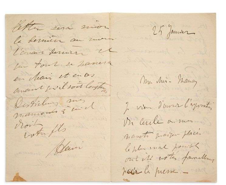 Lettre autographe signée adressée à sa mère, la comtesse Adèle-Zoé de Toulouse-Lautrec. [Paris], 25 janvier [1892]. 4 pages in-8 à l'encre brune sur papier sur un double feuillet (pliure horizontale, petite déchirure et petite tache d'encre).