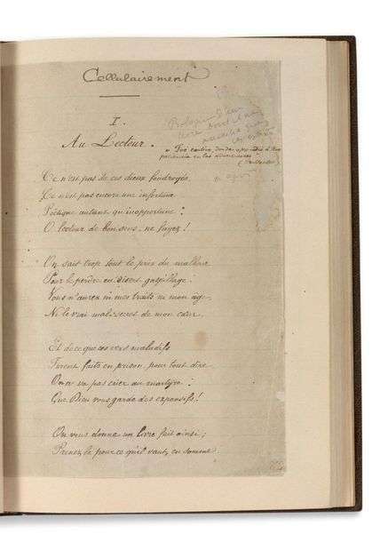 Bruxelles, Mons, 1873-1875. 32 poèmes manuscrits autographes de Paul Verlaine sur 69 pages petit in-4 numérotées par lui de 1 à 75 sur papier d'écolier à rayures bleues (chaque page est rayée avec 22 lignes). Parfois Verlaine a découpé une partie de la feuille en remaniant son texte (une moitié de la page 18, à laquelle est rajoutée une partie d'une autre feuille| et de la page 31| la page 36, où deux parties sont découpées pour enlever deux strophes). Il manque les pages 19, 20, 32-34| on passe directement de la page 42 à la page 45 portant de la main de Verlaine (‘'suite à 42 PV''). Le tout monté sur onglets. Plein maroquin taupe, dos à nerfs titré or, doublures ornées de maroquin vert bouteille, gardes moirées, emboîtage (Marius Michel).