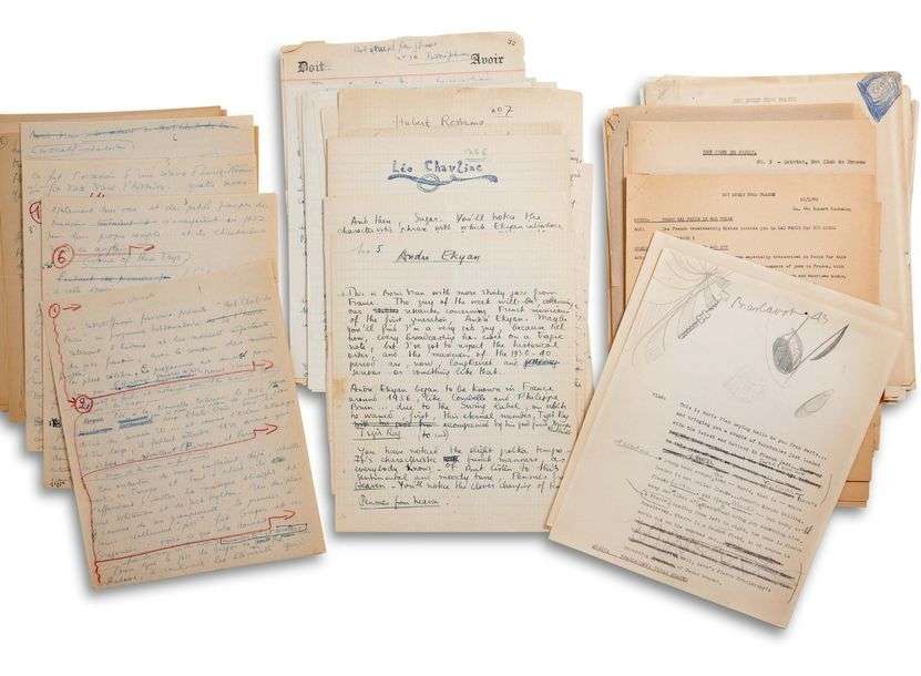 * le manuscrit autographe de 38 émissions (la première en français), offrant parfois deux versions de la même, plusieurs pages sur papier à en-tête de l’École centrale des Arts et Manufactures, puis de l’Office professionnel des industries et des commerces du papier et du carton, avec de nombreuses ratures et corrections, et parfois des dessins en marge |