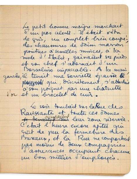 Scénarios et textes de chansons sous un cahier d'écolier, manuscrits autographes 30 pages in-8. «Rue des Ravissantes», scénario autographe de 16 pages à l'encre bleue. «[...] Le soir tombait sur la rue des Ravissantes et toutes ces dames occupaient leurs zones réservées. C'était l'heure encore agitée qui suit de peu la fermeture des bureaux... C'est Claudine qui la première, vit approcher le petit homme. Claudine avait 22 ans, 1m70 et 48 cm de tour de taille. Elle aurait pu être mannequin, mais son coeur généreux répugnait à laisser les admirateurs sur leur faim, aussi, moyennant le tarif, l'admirateur était admis à toucher [...]».