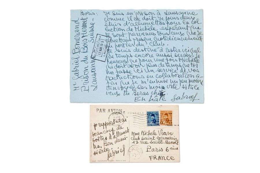 Lettre autographe signée et carte postale signée adressées à Boris VIAN [1949-1950], 1 page in-8 à l'encre sur papier bleu.