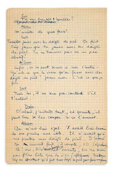 Pièce de théâtre relative à Adam et Ève, le serpent et Dieu. «[...] Devant le rideau. Dieu arrive en scène, suivi des anges qui s'éclaircissent la voix (vocalises : ah, ah, ah, mi, mi, mi) Dieu a une grosse sacoche et ressemble à un dessin de Jean Effel [...]».