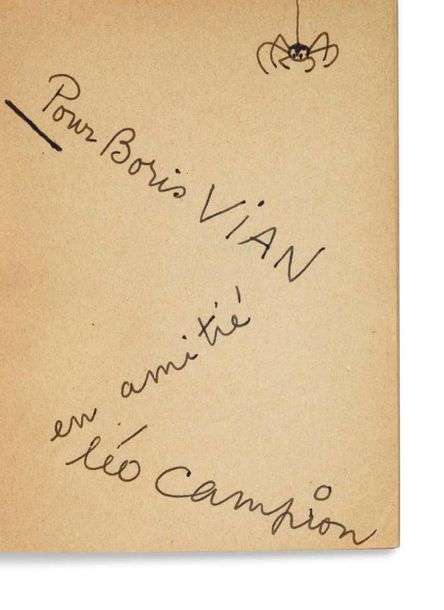 - Le petit Campion. [Paris], S.A.P.R.A, s.d.In-16, broché, couverture illustrée.Illustrations de Léo Campion. Envoi autographe signé de Léo Campion à Boris Vian illustré d'un petit dessin original représentant une araignée.