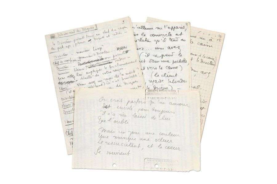 - [Philips Variétés]. Réalités. Projets d'albumUne vingtaine de pages autographes de différents formats à l'encre. Manuscrit autographe (3 pages ¼ in-4 à l'encre violette| perforations).«[...] aux jeunes adolescents boutonneux ou non qui commencent en rougissant d'envisager qu'un jour ils pourront prendre dans leurs bras velus la fillette ricanante à qui ils tiraient les cheveux depuis leur plus tendre jeunesse [...]».