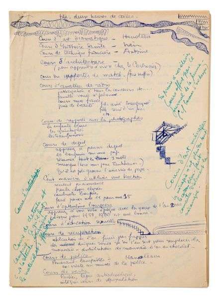 - Projets et idées d'émissions, manuscrit autographe6 feuillets in-4 et in-8 avec essais de signatures et petits dessins.Inédit.