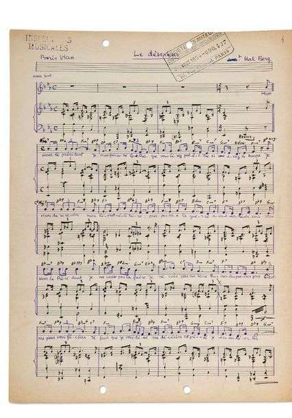 - Tapuscrit du texte complet, 1 page in-4 | - Partition musicale autographe. Texte autographe de Boris Vian et partition musicale autographe d’Harold Berg, 2 pages in-4| partition autographe de Vian au crayon, ½ page in-4 | - 2 fac-similés du texte et de la partition | - Partition imprimée, 2 pages in-4 | - Partition en italien.