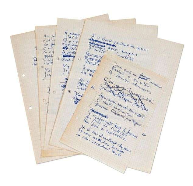 Manuscrit autographe, 5 pages perforées in-4 et in-8 à l'encre bleue, avec ratures et et corrections |