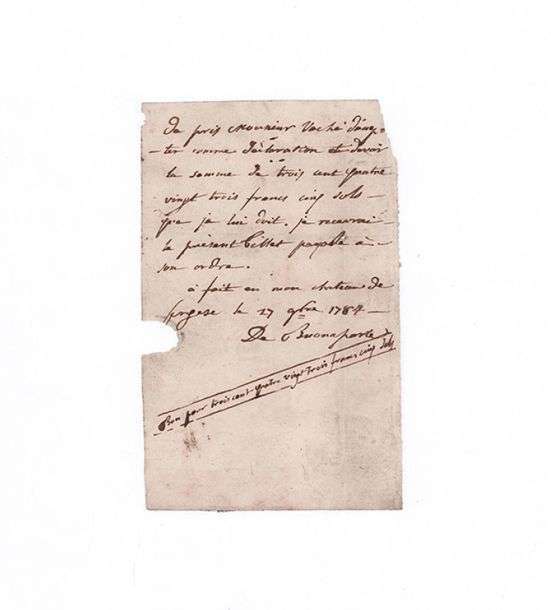«Je pris Monsieur Vaché d'accepter comme déclaration et devoir la somme de trois cent quatre vingt trois francs cinq sols que je lui doit. Je recevrai le présent billet payable à son ordre»...