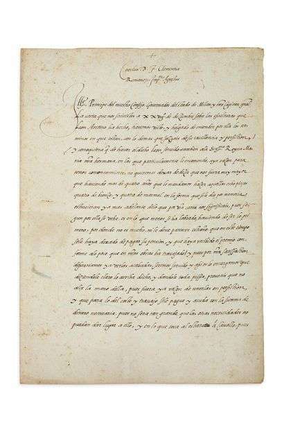 L.S. «Carolus», Bruxelles 31 janvier 1554, à Fernando de GONZAGA, prince de Molfetta, gouverneur du Milanais | contresignée par Francisco de VARGAS | 2 pages in-fol., adresse avec trace de cachet de cire rouge | en espagnol.