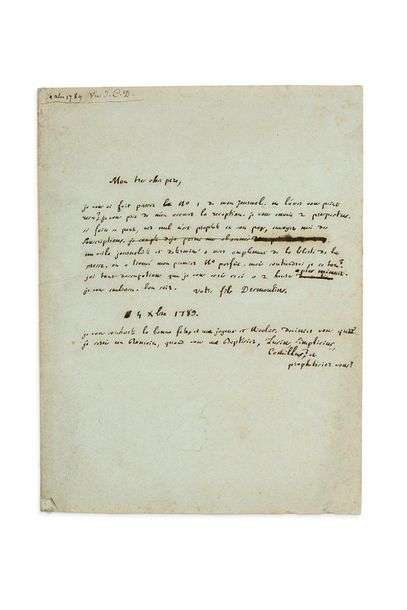 [Phrase barrée : Je compte deja parmi mes abonnés deux princes du sang.] Me voilà journaliste et determiné a user amplement de la liberté de la presse. On a trouvé mon premier n° parfait. Mais soutiendrai je ce ton ?»... En post-scriptum, il demande : «Deviniez vous que je serois un Romain, quand vous me baptisiez, Lucius, Simplicius, Camillus ? et prophetisiez vous ?»