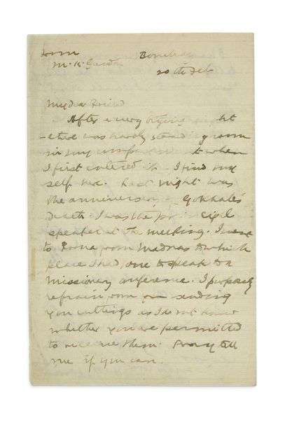 Après une nuit très éprouvante - il y avait à peine de la place pour se tenir debout dans son compartiment lorsqu'il y est entré - il se trouve à Bombay. La nuit dernière était l'anniversaire de la mort de GOKHALE. Gandhi était le principal orateur au meeting. Il est allé de Madras à Rama, où il devait parler à une conférence de missionnaires.
