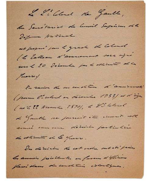 Mémorandum sur son éventuelle promotion au grade de colonel, à l'intention du sénateur Paul-Boncour. «Le Lt Colonel de Gaulle, du Secrétariat du Conseil Supérieur de la Défense Nationale, est proposé pour le grade de Colonel (le Tableau d'avancement sera signé vers le 20 décembre par le Ministre de la Guerre.) En raison de ses conditions d'ancienneté (promu lt colonel en décembre 1933) et d'âge (né le 22 novembre 1890), le Lt Colonel de Gaulle ne saurait être inscrit cette année sans une décision particulière du Ministre de la Guerre. Des décisions de cet ordre ont été prises les années précédentes en faveur d'officiers placés dans des conditions identiques. M. Paul-Boncour, à des titres multiples et évidents, notamment comme Président de la Commission d'Études de la Défense Nationale, pourrait, - s'il le jugeait à propos, - attirer l'attention de M. Fabry, personnellement, sur l'intéressé. Dans ce cas, il serait nécessaire que la démarche fût pressante et très urgente.»