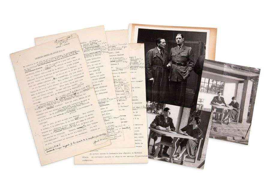 Un des premiers témoignages historiques, de l'action du général de Gaulle alors à Londres en 1943, manuscrit comportant de nombreux remaniement et ajouts de la main de Jean Oberlé, peintre illustrateur, proche de Max Jacob, et qui suivit De Gaulle dès 1940| il fut un des animateurs de l'équipe de la France libre à Radio Londres. A sa demande, de Gaulle accepta le 17 mai 1943, une interview, de manière à consigner pour la postérité son témoignage sur le mois de juin 1940. Prévu pour être lu à la radio le 18 juin 1943, le texte ne sera repris que plus tard et fut partiellement reproduit dans Jean Oberlé vous parle, publié en 1945. Il est très probable que les corrections et ajouts ont été fait sous la dictée de De Gaulle.