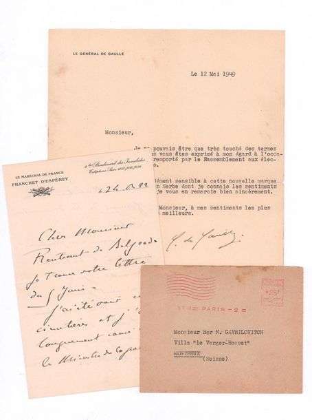 L.S. «C. de Gaulle», [Paris] 12 mai 1949, à Bor N. GAVRILOVITCH, à Montreux | 1 page in-4 dactylographiée, à son en-tête Le Général de Gaulle, enveloppe (fentes au pli).