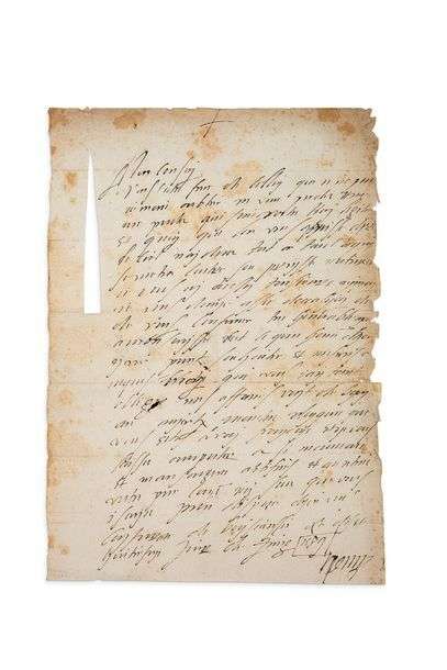 [Le Roi fait ici appel à la loyauté du frère de son favori Anne de Joyeuse, tué à la bataille de Coutras le 20 octobre 1587. Il lui annonce l'amélioration de ses affaires grâce à sa réconciliation avec Henri de Navarre en avril 1589, les deux princes étant désormais unis contre les Ligueurs.] «Mon cousin, Vous esties frere de celluy que je ne puis jamais oublier ni veus perdre vous un proche qui suis vostre Roy legitime et quoy que lon vous puisse dyre le ciel naydera tost ou tard ce quy se metra contre son prinsse naturel. Je vous ay aussy tousjours aymay je vous donne asses doccasyon de vous conserver tres honorablement a mon servisse. Cest ce qun homme dhonneur peust souhaiter [...]