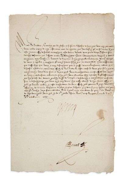 L.S. «Henry», au camp du Pont St Pierre 10 octobre 1590, au comte de ROYBOUS | contresignée par son secrétaire d'État Louis de REVOL (1531-1594) | 1 page in-fol., adresse au verso.