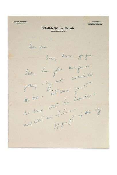 L.A.S. «Jack», [12 septembre 1954], à John MCGUIRE, à l'Ætna Finance Company, à Jacksonville (Floride) | 1 page et quart petit in-4 à en-tête United States Senate et à son nom, enveloppe autographe avec sa griffe | en anglais.