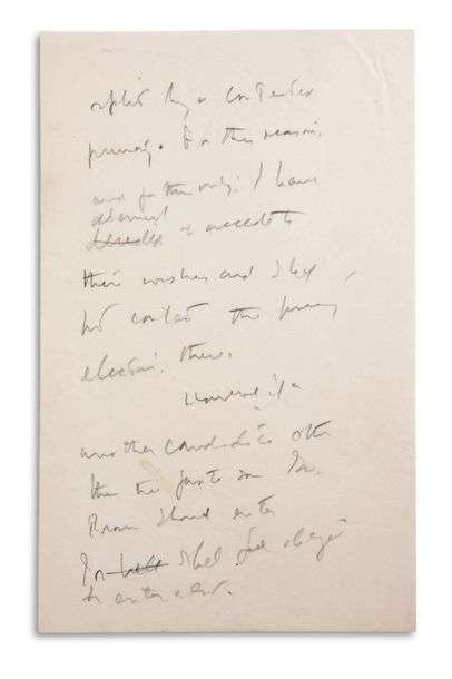Fragment de brouillon d’une déclaration de désistement de la primaire du Parti démocrate en Californie, lors de la campagne présidentielle de 1960, avec référence au très populaire gouverneur démocrate de cet État, Pat Brown. Kennedy invoque l’éventualité de désunion causée par une primaire contestée : pour cette raison et seulement cette raison, il a décidé d’accéder à leurs vœux et ne concourra pas dans l’élection primaire. Toutefois, si un candidat autre que le fi ls préféré, Mr. Brown, devait entrer en lice, il se sentira obligé d’en faire autant…