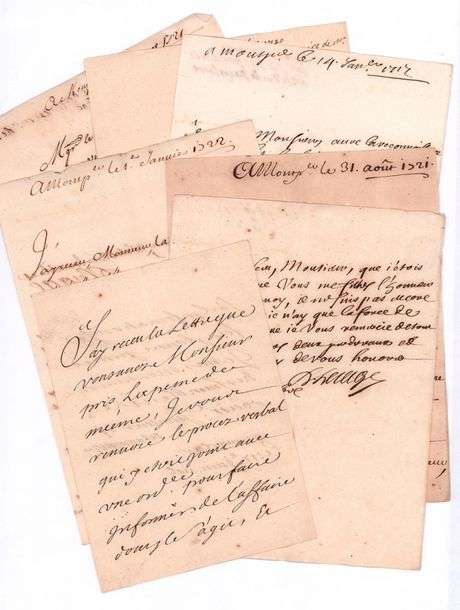 Lettres du marquis de La Fare-Laugières, J.-B. Roquefeuille, D. Lesage (secrétaire du duc de Roquelaure), etc. : envois d'un procès-verbal avec ordonnance et d'une requête | invitation à fournir du gibier à un repas à l'occasion du rétablissement de la santé du Roi (1721) | félicitations de l'heureux accouchement de sa belle-fille née de La Fare de Montclar | affaires, voeux, remerciements...